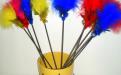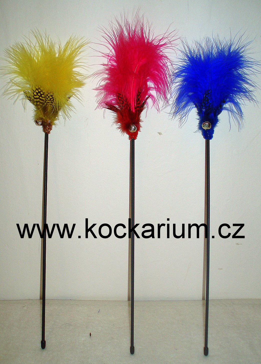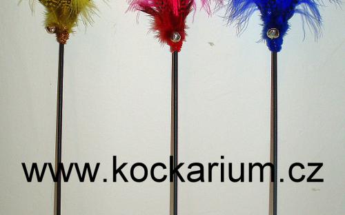 Kočičí mávátko je vyrobeno z plastu a peří, součástí škádlítka je rolnička o průměru 12 mm. Délka násadky 30 cm, celková délka 35-40 cm. Různé barvy, v případě zájmu o konkrétní barvu uveďte Váš požadavek do poznámky objednávky, pokusíme se vyhovět.