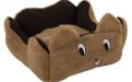 Vyšší okraj ve tvaru hlavy a nohou plyšového zvířátka tvoří místo pro pohodlný odpočinek. Světle hnědý povrch z plyše. Uvnitř pelíšku je hladký, tmavě hnědý povrch.